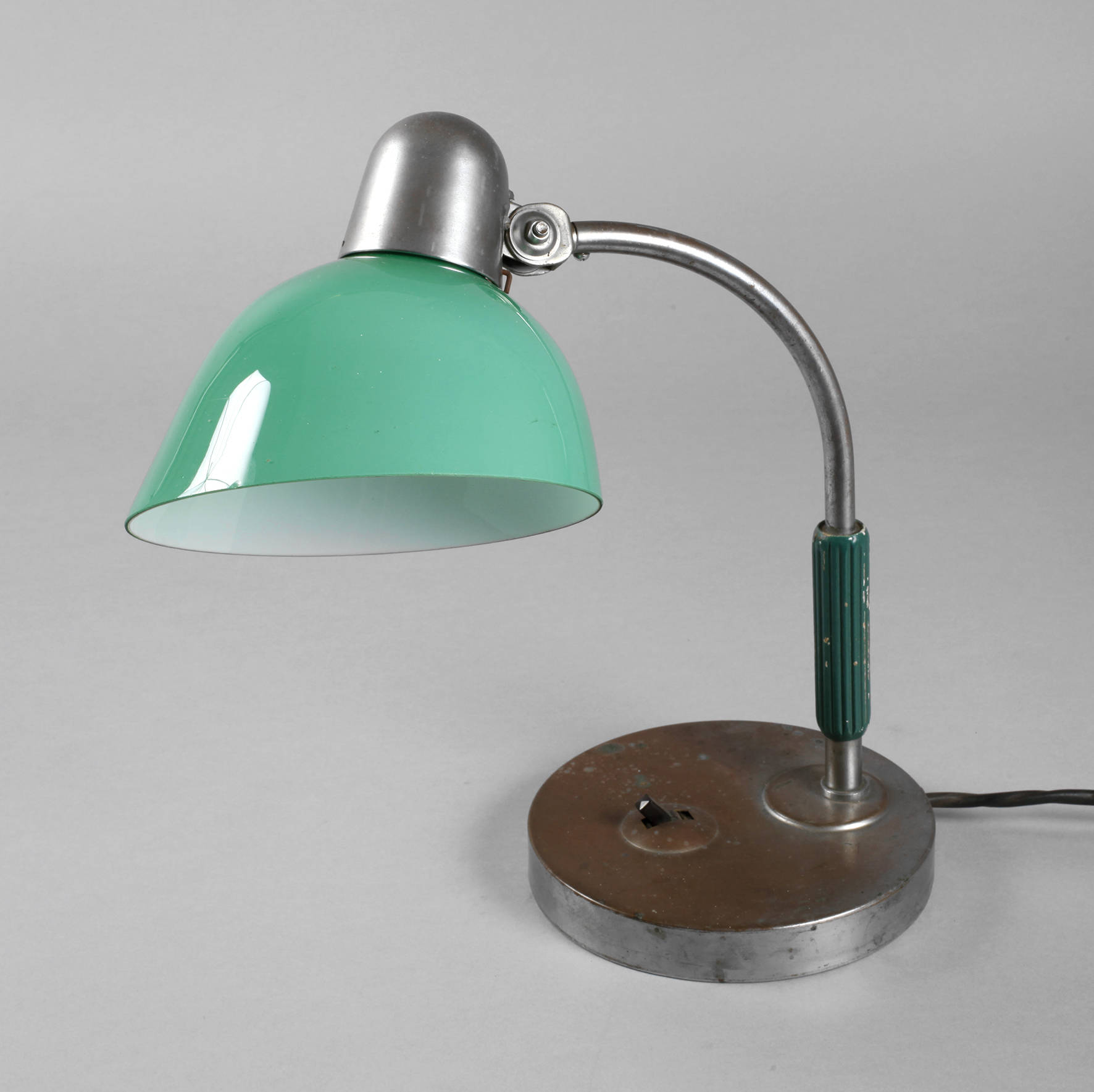 um 1930, Rundfuß aus Weißblech mit schlankem, geneigten Leuchterarm, daran grün überfangener Kuppelschirm, einflammig alt elektr., Korrosionsspuren, H 37 cm.