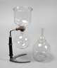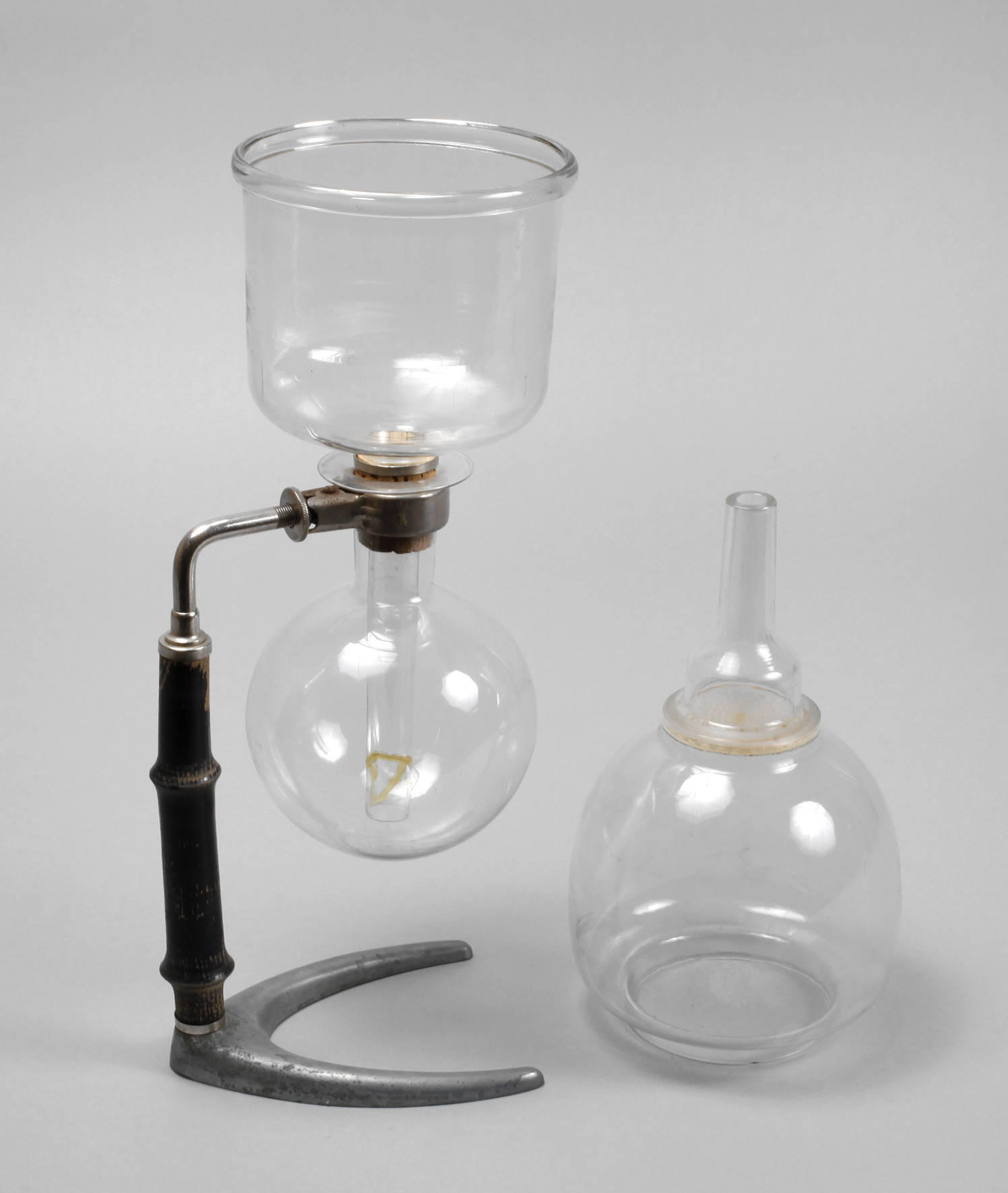 Entwurf von Gerhard Marcks 1926, Gestell des Wasserkochers aus Aluminium, geschwärztem Holz und vernickeltem Metall, original Wasserzylinder, dazu zwei Einsätze für die passende Kaffeemaschine, einer davon geklebt, der andere später, gemarkt Schott & Gen./Mainz, H Gestell mit Zylinder 26 cm. Quelle: Bauhausarchiv Septemberkatalog 1981, S. 122 , Abb. 235.