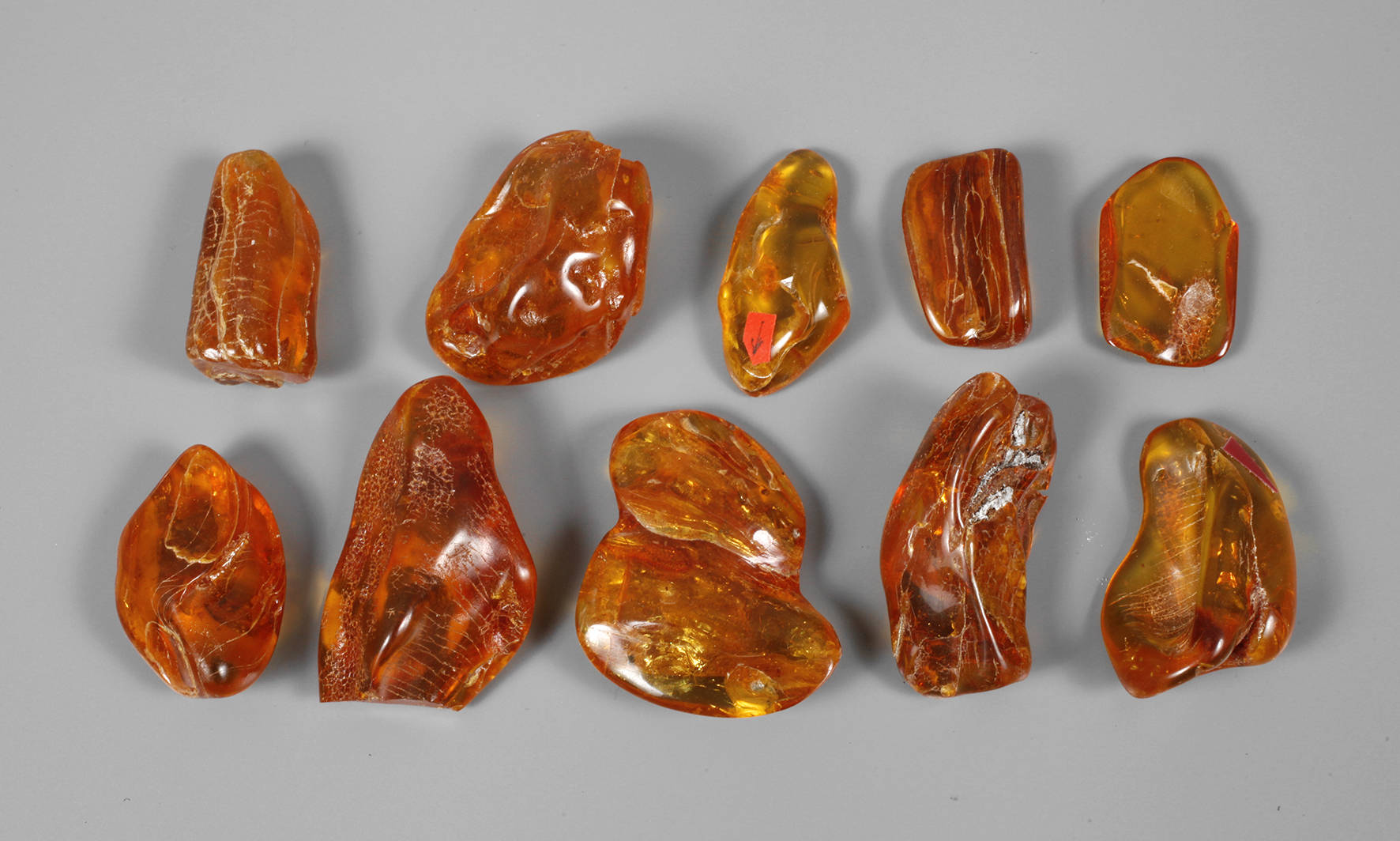 goldgelbe Farbe, jeweils mit einer oder mehreren Inklusen, Fundort Polen, Länge max. 43 mm, Gesamtgewicht ca. 64,6 g.