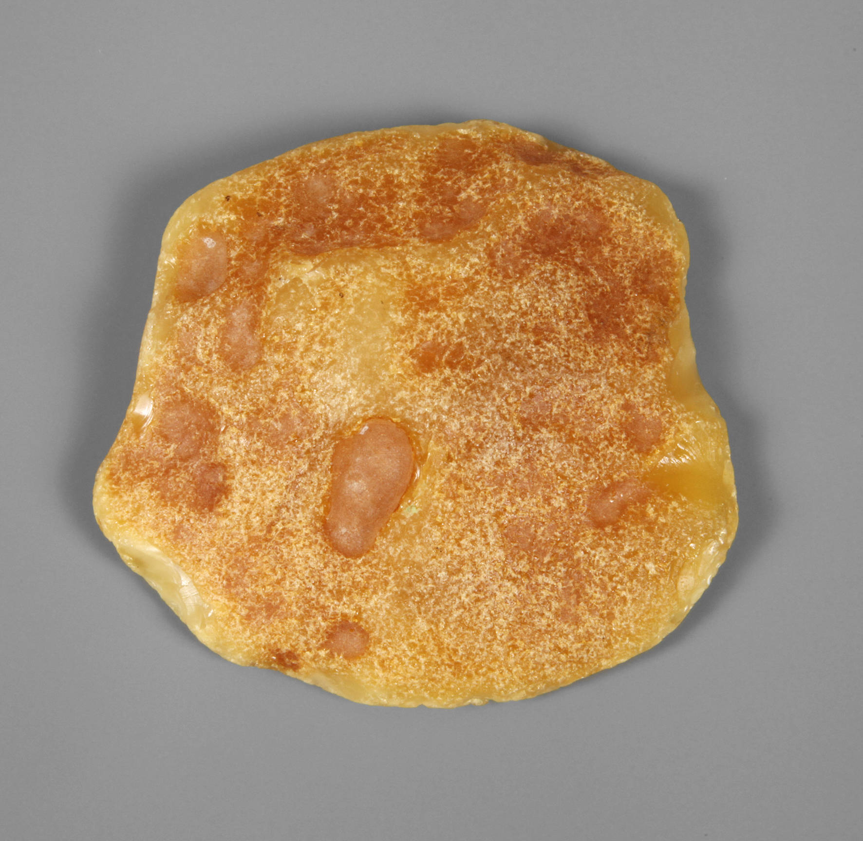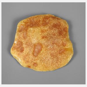 hellgelb, trüb mit Verwitterungsrinde, Größe ca. 50 x 52 x 15 mm, Gewicht ca. 18,3 g.
