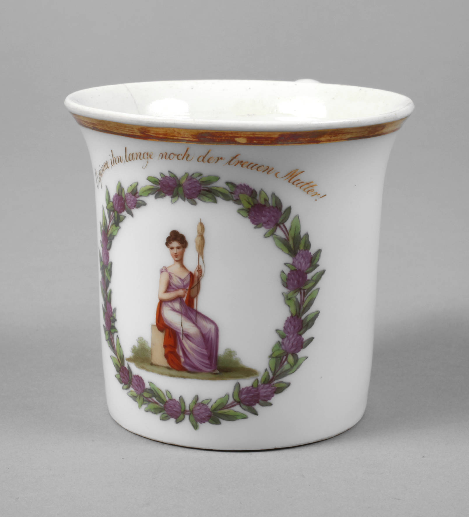 blaue Zeptermarke und braune Adlermarke um 1844-1847, Zylindertasse mit ausschwingendem Lippenrand, Henkel mit Blattabschlüssen, schauseitig fein bemalt, Mädchendarstellung im Blütenkranz aus Klee, Goldstaffage, Spruch: ”O spinne ihn lange noch der treuen Mutter!”, rückseitig ein langer Haarriss, ohne Untertasse, H 8,5 cm.