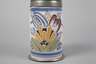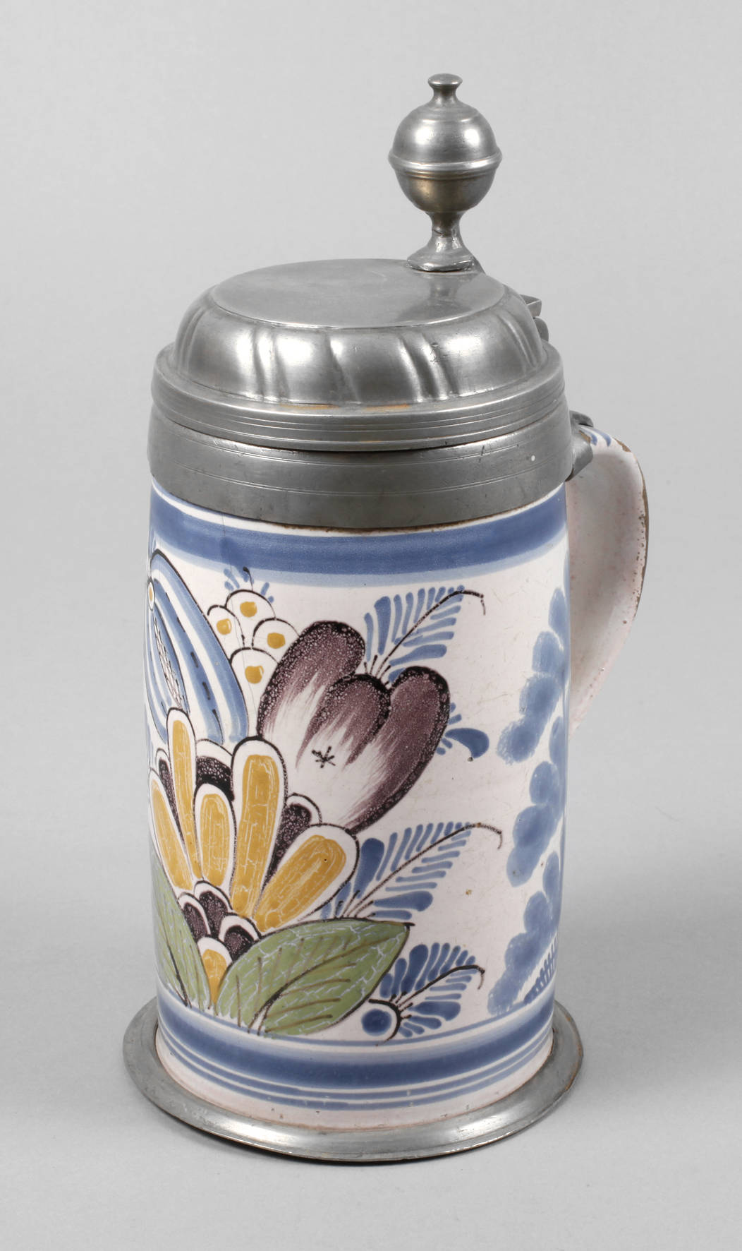 um 1790, rötlicher Scherben mit weißer Glasur, bunt mit Scharffeuerfarben bemalt, floraler Dekor, Zinnmontur bestehend aus Standring, breitem Lippenrand und übergreifendem godronierten Deckel mit Kugelrast, Montur neu verleimt, haarrissig mit Fehlstelle unter der Montur, H 24 cm.