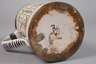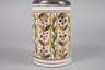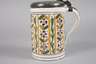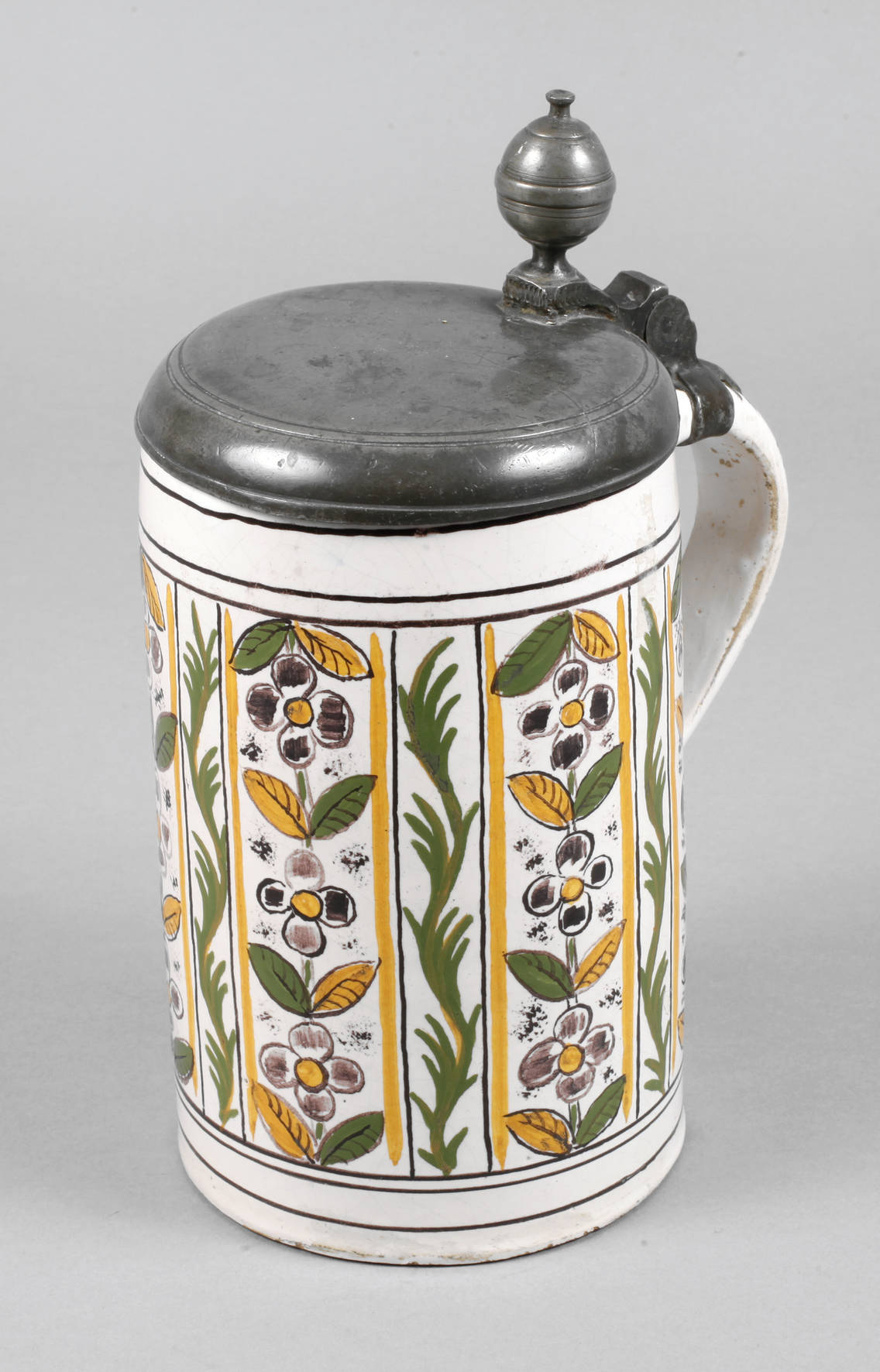 um 1780, monogrammiert BK, in Hannoversch Mündner Art, auf weißer Lasur in bunten Scharffeuerfarben bemalt, senkrecht gebänderter, floraler Dekor, leicht gewölbter Zinndeckel mit Kugelrast, etwas glasurrissig und kleinere Fehlstellen am Stand, H 23,5 cm. Quelle: Dr. JGH Graesse, Führer für Sammler von Porzellan und Fayence, Klinkhardt & Biermann 1999, S. 25–29.