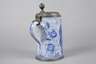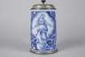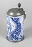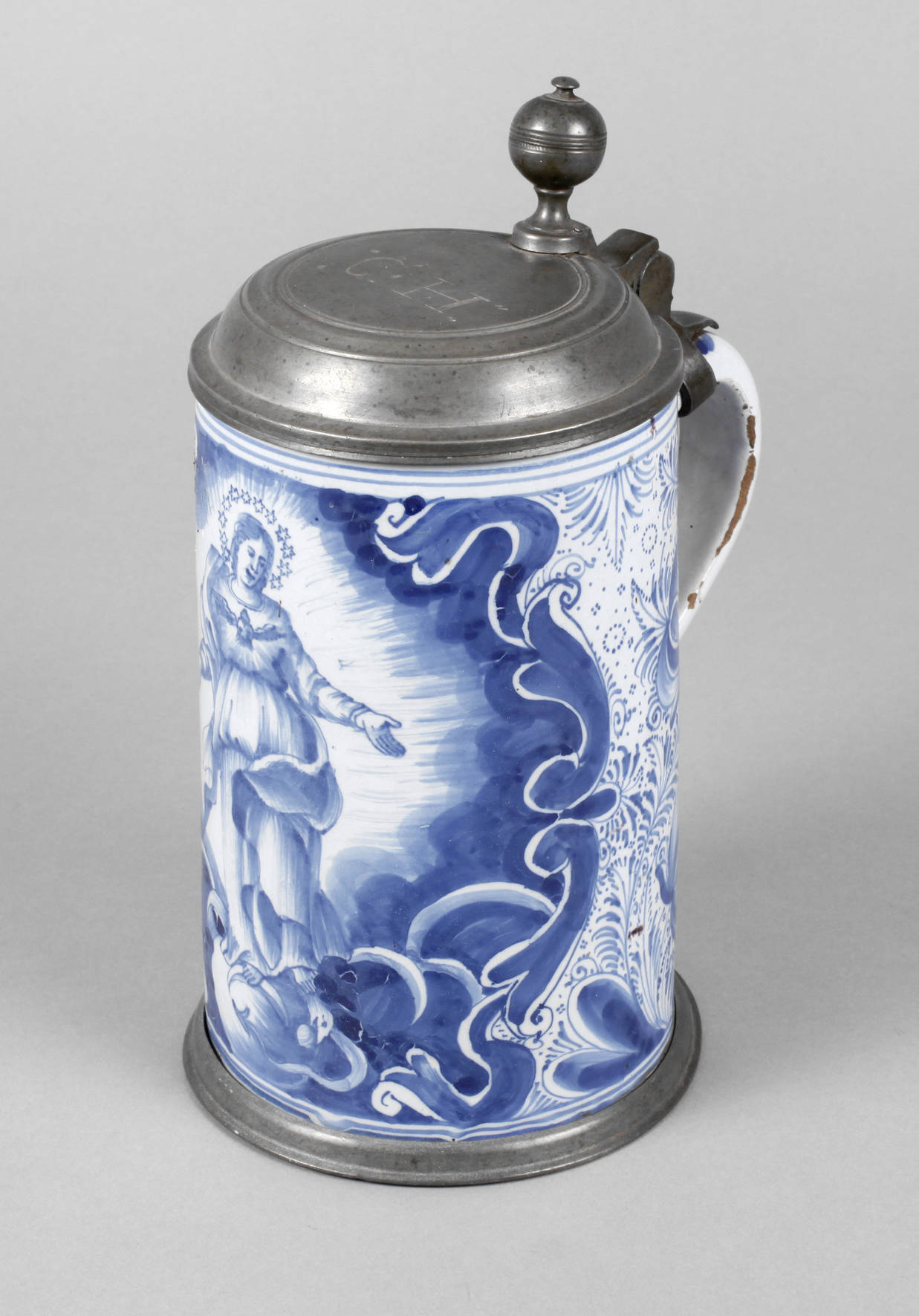 aus der Werkstatt Johann Friedrich Kordenbusch, um 1750, am Boden monogrammiert, rötlicher Scherben handabgedreht, weißliche Glasur, in kobaltblauer Scharffeuerfarbe bemalt, Mondsichelmadonna zwischen Rollwerk, seitlich Blütenmotive, astartig bemalter Henkel, übergreifender Zinndeckel mit graviertem Besitzermonogramm CH, Zinnstandring, Glasurabplatzer am Henkelrand und ein kaum sichtbarer Haarriss seitlich, H 22 cm. Künstlerinfo: Johann Friedrich Kordenbusch (um 1720–1763) war erst Maler an der Nürnberger Fayencemanufaktur, später eigene Malwerkstatt, welche der Manufaktur angegliedert war, wurde berühmt mit seinen sogenannten Madonnenkrügen. Quelle: Internet.