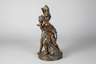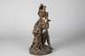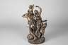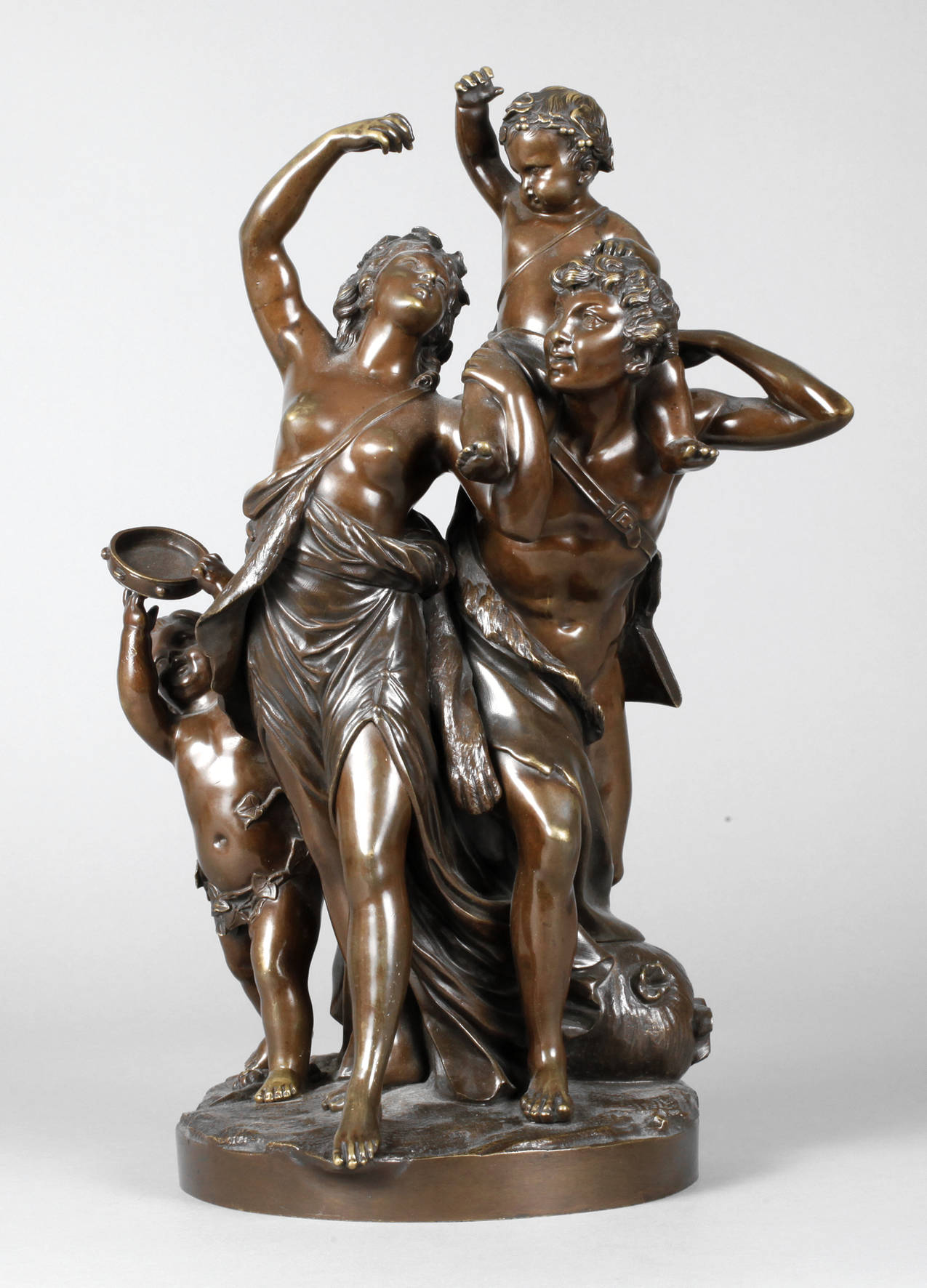 nach Claude Michel, genannt Clodion, Ausformung um 1900, Bronze bräunlich patiniert, Halbaktdarstellung von Bacchus und Ariadne, begleitet durch zwei mit Weinlaub geschmückte Putten, Triumphzug bei der Heimkehr des Gottes Dionysos (römisch Bacchus) nach der friedlichen Unterwerfung von Asien (durch Feierlichkeiten statt Krieg) bzw. bei der Feier seiner Verbindung mit der sterblichen Ariadne, Bacchus im Löwenfell und mit Panflöte, auf weinlaubgeschmückter Plinthe mit heruntergefallenem Speer, Oberfläche mit Altersspuren und minimal zerkratzt, H gesamt ca. 40,5 cm. Künstlerinfo: Claude Michel, auch ”Clodion” (1738 Nancy bis 1814 Paris), französischer Bildhauer, lernte bei seinem Onkel Lambert Sigisbert Adam und bei Jean-Baptiste Pigalle, erhielt den ”Grand Prix de Sculpture” und arbeitete unter anderem in Rom für Herzog de La Rochefoucauld und für Katharina II. sowie für den französischen König Ludwig XVI. Quelle: Internet.