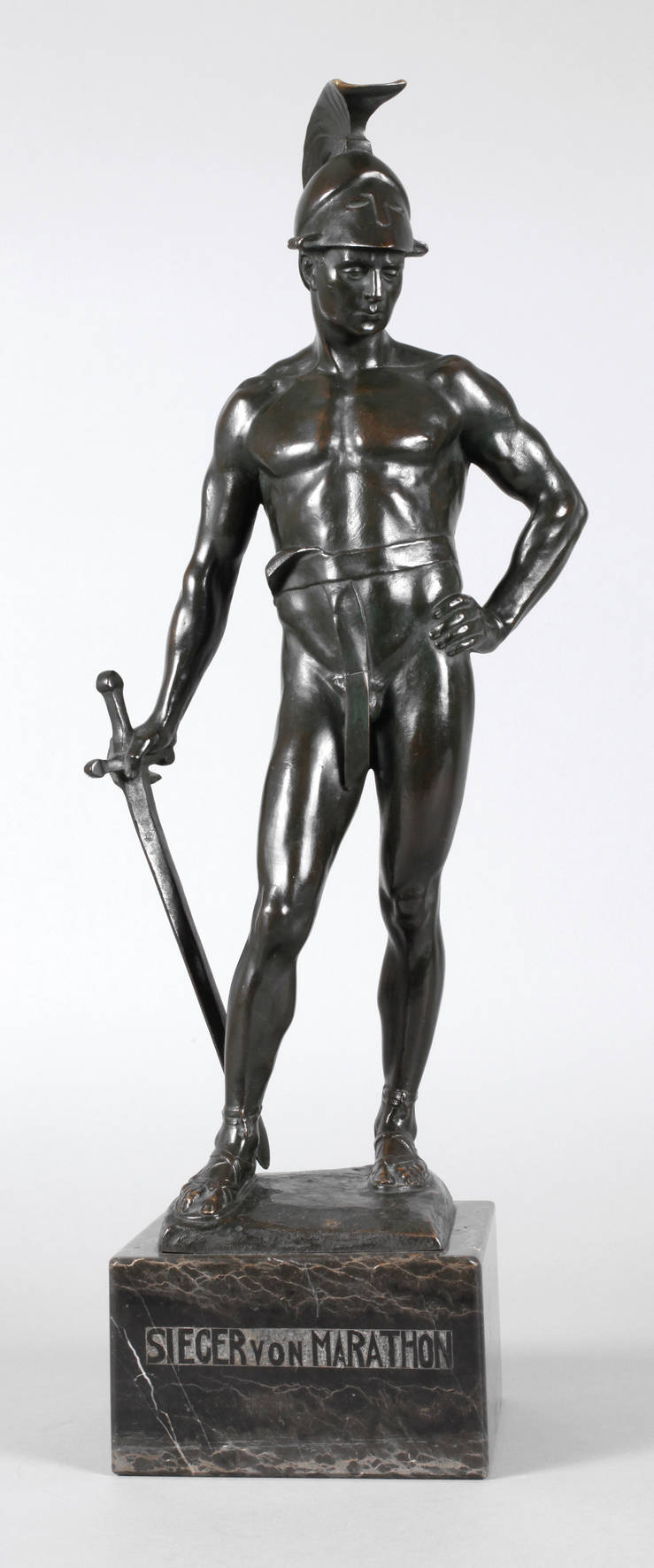 um 1900, auf der Plinthe signiert Prof. V. H. Seifert, Bronze dunkel patiniert, stehender Athener Krieger nach dem Sieg bei der Schlacht um die Ebene von Marathon, in typischer Aufmachung mit Sandalen, Lendenschurz, Helm und Schwert, Sockel vorderseitig bezeichnet Sieger von Marathon, auf naturalistischer quadratischer Plinthe, auf einen dunklen Marmorsockel montiert, fachgerecht restauriert, H 52 cm, H gesamt 61 cm.
