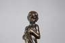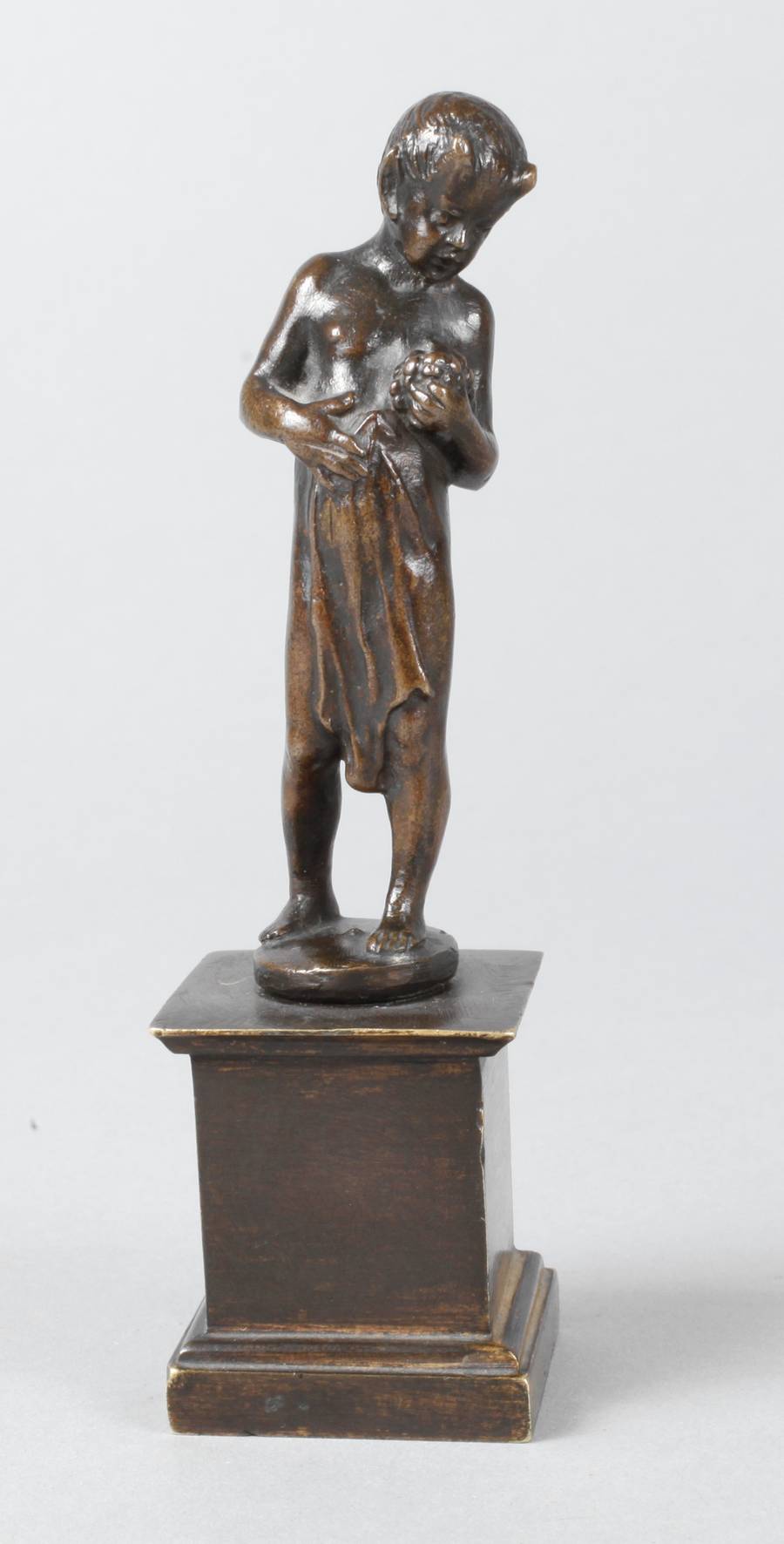 um 1900, unsigniert, Bronze dunkel patiniert, Faun als Bacchant mit Weintrauben in der Linken, sich mit einem kleinen Tuch verhüllend, auf runder Plinthe, auf einen getreppten Metallsockel als Podest montiert, gute Erhaltung, H Figur 8 cm, H gesamt 12 cm.