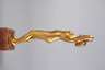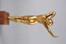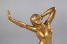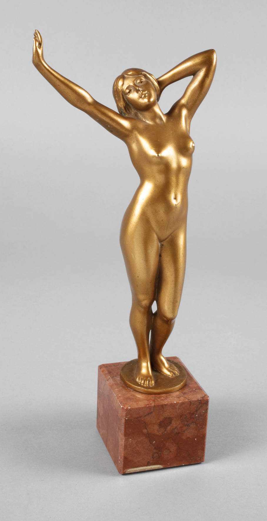 um 1900, auf der Plinthe signiert Rudolfi., Bronze golden patiniert, erotischer Damenakt, beim morgendlichen Erwachen, die Arme gen Himmel reckend, auf flacher runder Plinthe, auf einen kubischen, rötlichen Marmorsockel mit angeschrägten Kanten montiert, minimale Altersspuren, H 27 cm, H gesamt 33 cm.