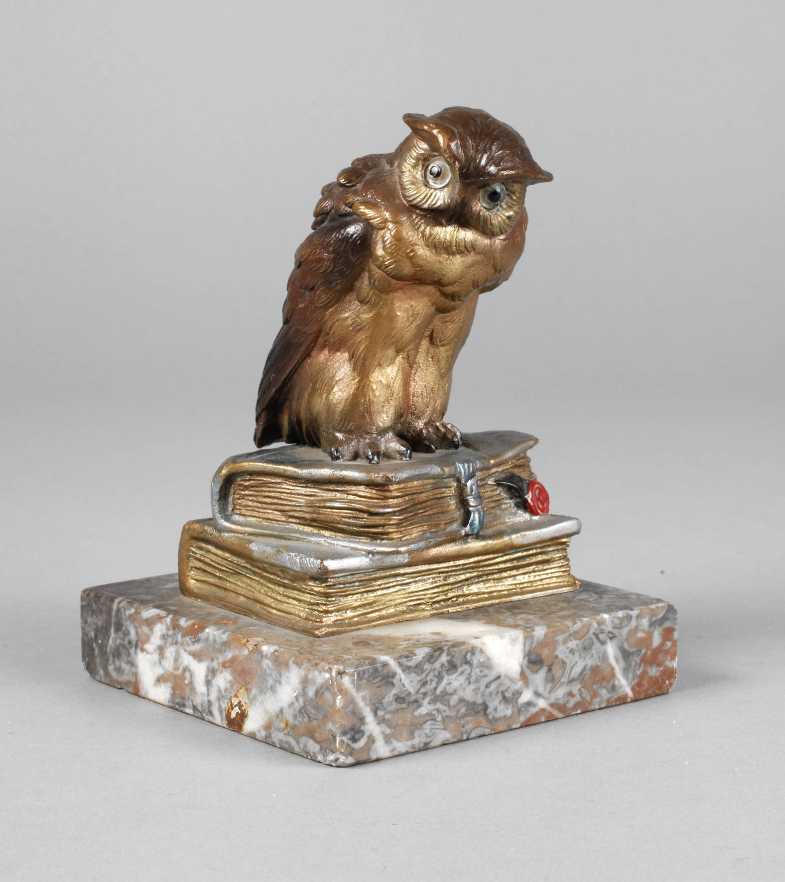 um 1930, unsigniert, Bronze, polychrom in Kaltbemalung staffiert, fein ziselierte Eule in naturalistischer Ausformung mit Glasaugen, auf einem Bücherstapel sitzend, auf einen quadratischen rötlich-grauen Marmorsockel montiert, gute Erhaltung, Sockel minimalst bestoßen, H 11 cm, H gesamt 13 cm.
