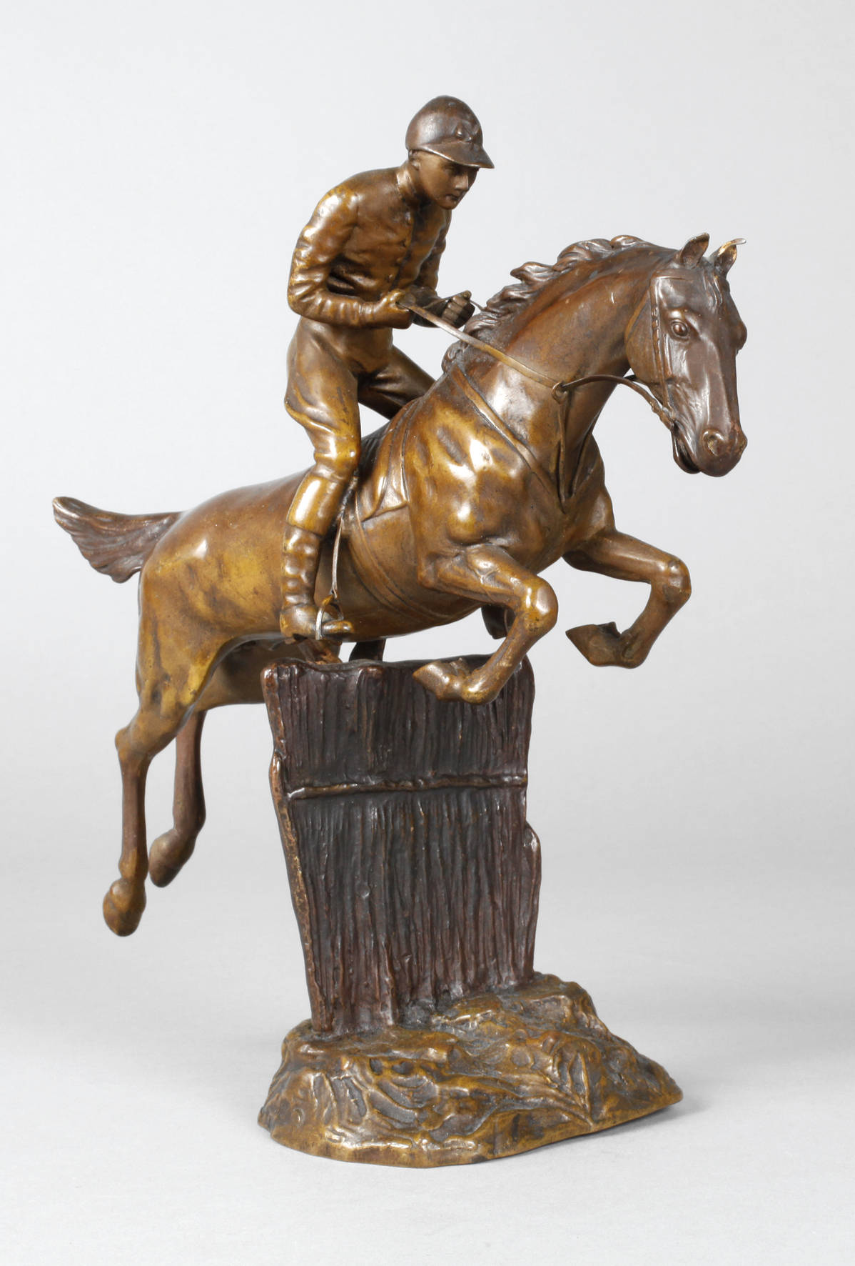 um 1900, signiert Tosca und Gießerstempel K im Hufeisen, Bronze gelblich-braun patiniert, Darstellung eines Jockeys mit seinem Pferd im Hürdenrennen, auf naturalistischer Plinthe mit Hindernis, winzigste Verluste der Patina, H gesamt 25,5 cm.