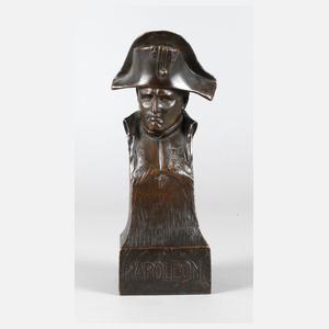 Wien, 1. Hälfte 20. Jh., signiert Titze und monogrammiert AT ligiert, Bronze dunkelbraun patiniert, Büste des Napoleon Bonaparte mit Zweispitz, in Uniform, sich nach unten hin zu einem Sockel erweiternd, mit Metallplatte verschraubt, vorne bezeichnet Napoleon, gute Erhaltung, H gesamt 24 cm.