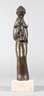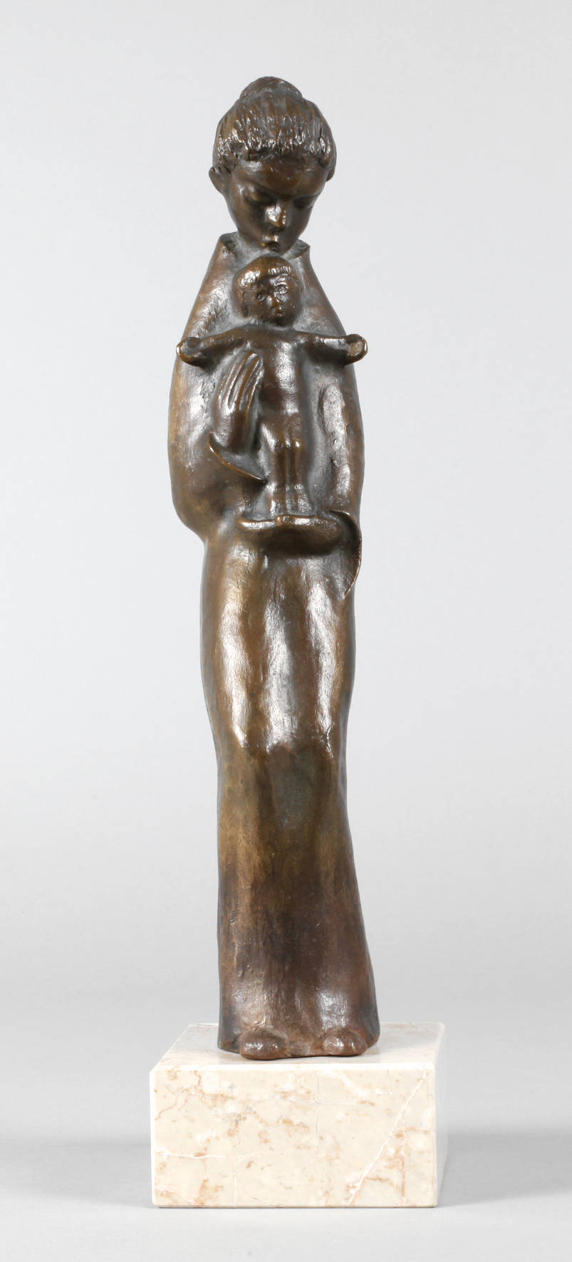 20. Jh., rs. undeutlich monogrammiert HB, Bronze braun patiniert, stehende Frauenfigur, ein Kleinkind auf ihren Armen haltend, in moderner Formensprache, auf quadratischen Steinsockel montiert, H Bronze 35,5 cm, H gesamt 40,5 cm. Künstlerinfo: deutscher Bildhauer (1902 Köln bis 1883), studierte an der Kölner Kunstschule, später bei Wallner in Wien, tätig in Herchen, meist zu religiösen Themen. Quelle: Internet.