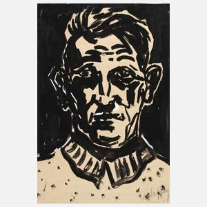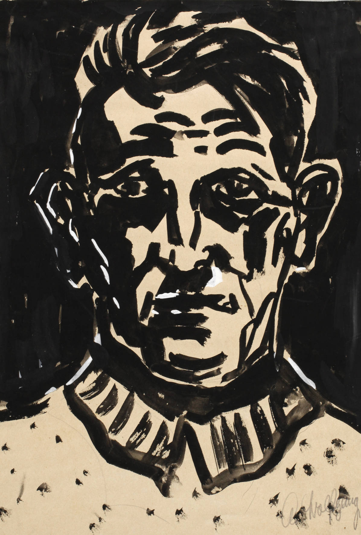 Kopfbildnis eines Mannes mittleren Alters vor dunklem Grund, Tuschpinselzeichnung, partiell mit Korrekturen in weißer Gouache, um 1930, rechts unten in der Darstellung in Blei signiert ”A. Wolfgang”, auf Karton aufgeheftet, hier nummeriert 204, geringe Altersspuren, ungerahmt, Blattmaße ca. 30,5 x 21 cm. Künstlerinfo: dt. Maler, Zeichner und Graphiker (1894 Arnstadt bis 1970 Gera), ab 1908 in Gera, hier kaufmännische Lehre, 1913–18 Wehr- und anschließend Kriegsdienst, während des Kriegsdienstes in Frankreich Hinwendung zur Malerei, 1919–30 kaufmännische Tätigkeit als Schokoladengroßhändler in Gera und parallel intensive, autodidaktische Beschäftigung mit Malerei, unternahm Studienreise nach Frankreich, beeinflusst von seinem Schwager Otto Dix sowie Alfred Ahner und Kurt Günther, Mitglied der spätdadaistischen Vereinigung ”pro pro bru (produktive-prominente-brummochsen)”, ab 1930 freischaffend als Maler, Mitglied im Reichsverband Bildender Künstler Deutschlands und im Thüringer Ausstellerverband Bildender Künstler, 1942–45 Kriegsdienst, 1945 Initiator der Künstlergilde Gera und bis 1950 deren Leiter, Mitglied im Verband Bildender Künstler (VBK) der DDR, hier zeitweise Jury- und Vorstandsmitglied im Bezirk Gera, 1961 Ehrung mit dem Kunstpreis der Stadt Gera, tätig in Gera-Untermhaus, Quelle: Dressler, Vollmer, Eisold ”Künstler in der DDR” und Internetseite der Stadt Gera.