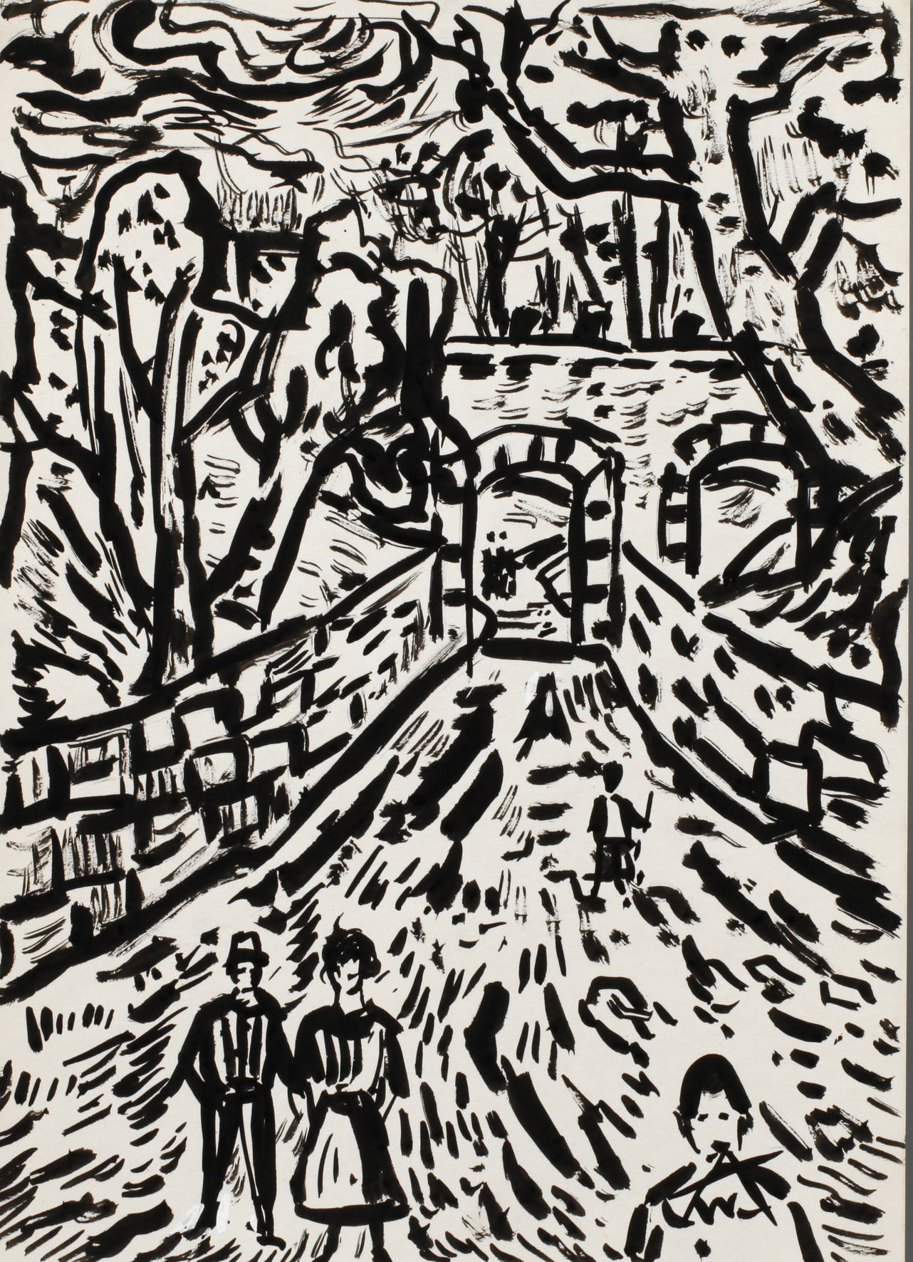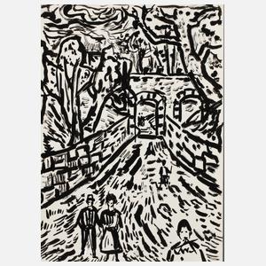 Szene auf den Hainberg über Gera-Untermhaus, mit Blick auf die ehemalige Brücke zum Schloss Osterstein, expressive Tuschpinselzeichnung in schwarz, partiell mit Korrekturen in weißer Gouache, um 1960, rechts unten in der Darstellung in Tusche sternförmig ligiert monogrammiert ”AW”, rückseitig Montierungsspuren, geringe Altersspuren, ungerahmt, Blattmaß ca. 42 x 29,5 cm. Künstlerinfo: dt. Maler, Zeichner und Graphiker (1894 Arnstadt bis 1970 Gera), ab 1908 in Gera, hier kaufmännische Lehre, 1913–18 Wehr- und anschließend Kriegsdienst, während des Kriegsdienstes in Frankreich Hinwendung zur Malerei, 1919–30 kaufmännische Tätigkeit als Schokoladengroßhändler in Gera und parallel intensive, autodidaktische Beschäftigung mit Malerei, unternahm Studienreise nach Frankreich, beeinflusst von seinem Schwager Otto Dix sowie Alfred Ahner und Kurt Günther, Mitglied der spätdadaistischen Vereinigung ”pro pro bru (produktive-prominente-brummochsen)”, ab 1930 freischaffend als Maler, Mitglied im Reichsverband Bildender Künstler Deutschlands und im Thüringer Ausstellerverband Bildender Künstler, 1942–45 Kriegsdienst, 1945 Initiator der Künstlergilde Gera und bis 1950 deren Leiter, Mitglied im Verband Bildender Künstler (VBK) der DDR, hier zeitweise Jury- und Vorstandsmitglied im Bezirk Gera, 1961 Ehrung mit dem Kunstpreis der Stadt Gera, tätig in Gera-Untermhaus, Quelle: Dressler, Vollmer, Eisold ”Künstler in der DDR” und Internetseite der Stadt Gera.