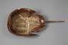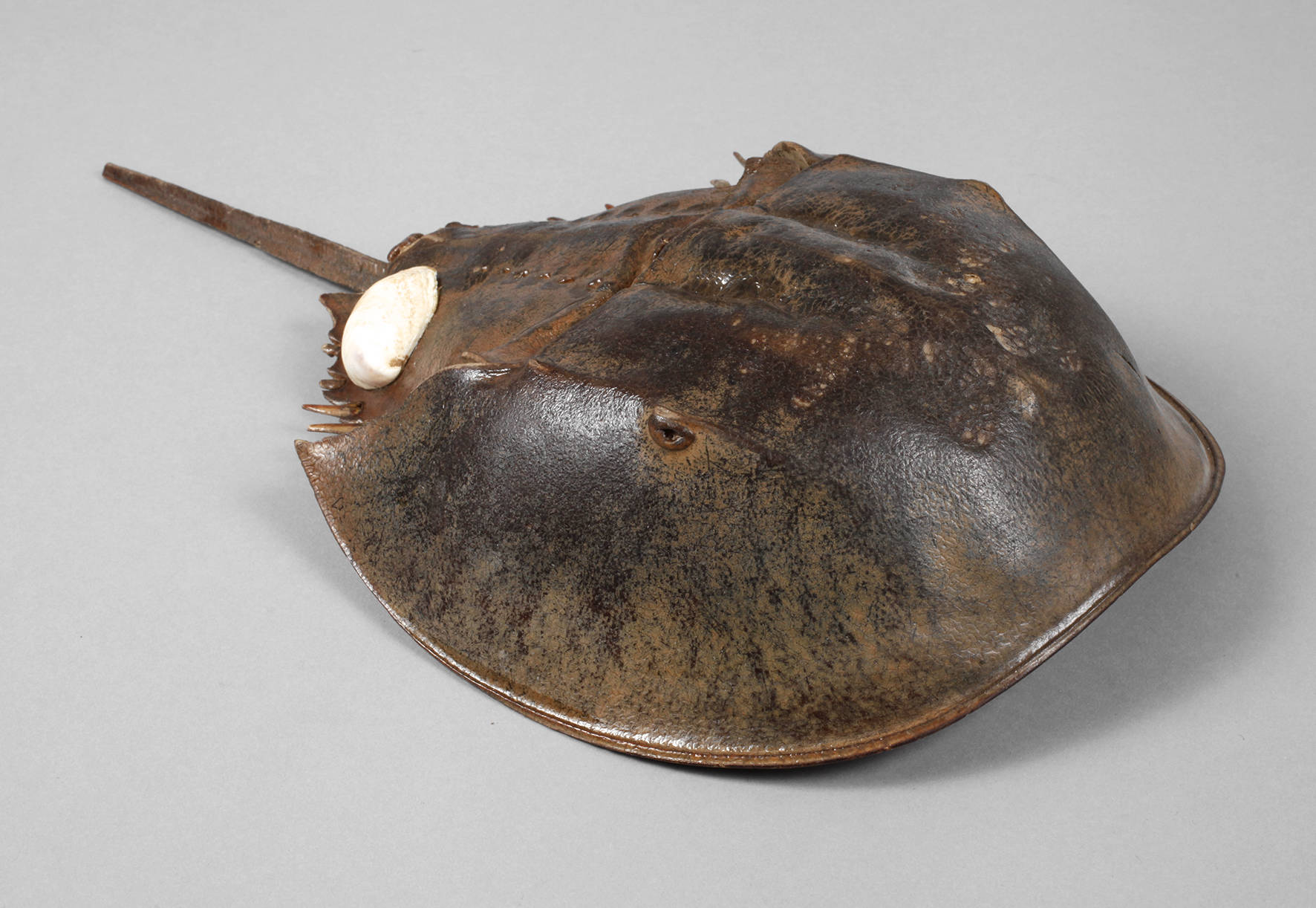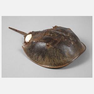 unbestimmten Alters, das sog. Lebende Fossil der Weltmeere, Unterart Limulus Polyphemus, welche man an der amerikanischen Atlantikküste findet, diese Tierart überlebte seit Millionen Jahren alle Naturkatastrophen, aufsitzend eine kleine Muschel, L 37 cm.