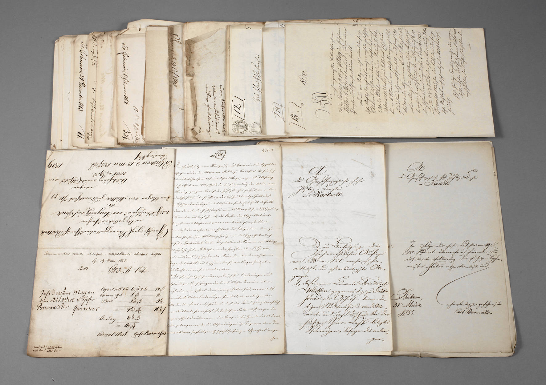 meist 19. Jh., vorw. Gerichtsakten des Großherzoglichen hohen Gerichts zu Rostock und Schwerin, unter anderem in Erbangelegenheiten und Vormundschaftssachen, Mitte bzw. 2. Hälfte 19. Jahrhundert, weiterhin einige wenige Schriftstücke in Erbangelegenheiten des 18. Jahrhunderts aus Schwerin und Güstrow, Tusche auf Büttenbogen bzw. Holzschliffpapier, einige mit roten Wachssiegeln, nicht kollationiert, ca. 90 Blatt, untersch. Erhaltungszustände und Formate, Blattmaß max. ca. 33 x 20,5 cm.