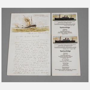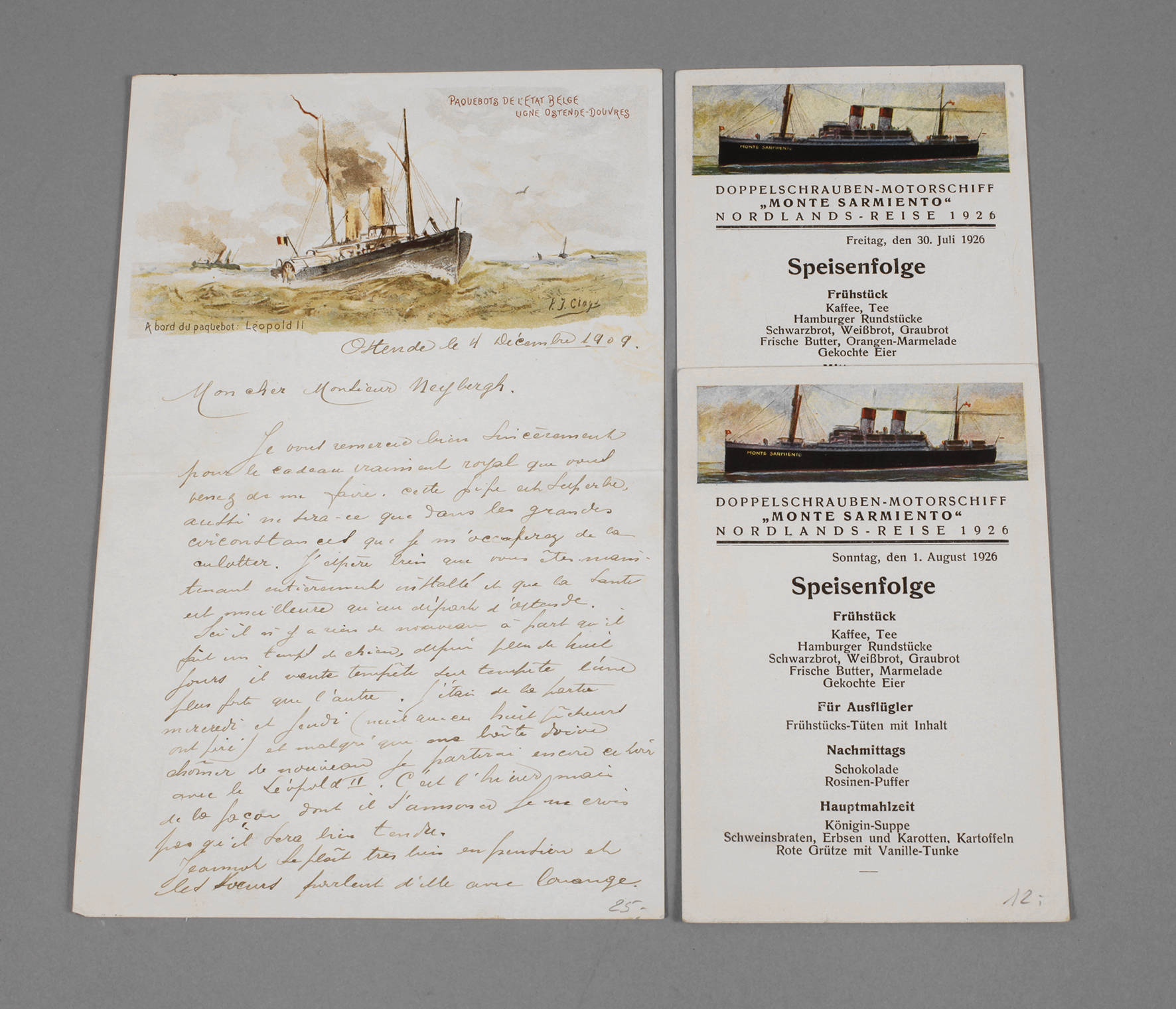 bestehend aus handschriftl. Briefbogen (Bordpost), chromolith. Briefkopf mit Darstellung des Dampfers Leopold II. von P. J. Clays, datiert Ostende 1909, sowie zwei Menükarten des Doppelschrauben-Motorschiffs ”Monte Sarmiento”, datiert Nordland-Reise 1926, mit Schiffsdarstellung und verso als Postkarte gestaltet, min. Alters- und Gebrauchsspuren, Maße 22,5 x 14 cm sowie 14 x 9 cm.