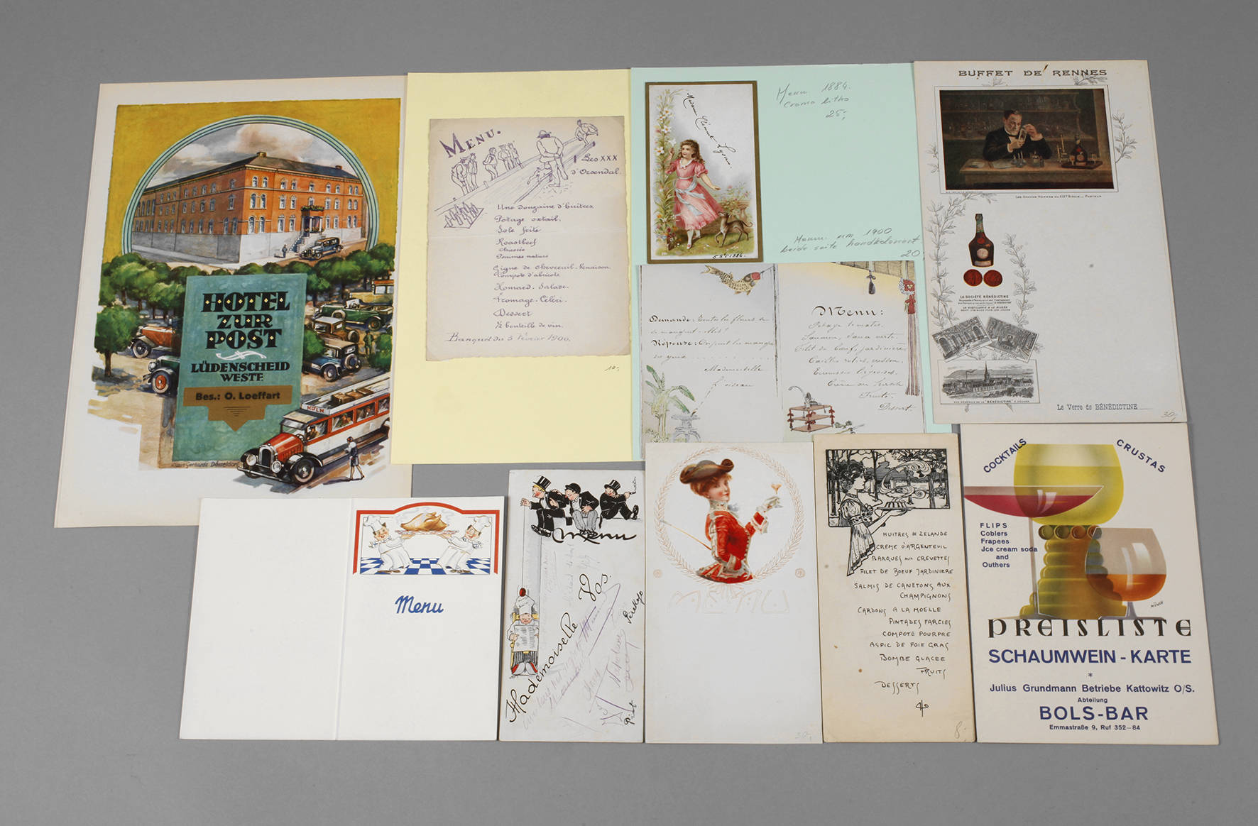 um 1900, zehn versch. Menükarten auf Deutsch bzw. Französisch, meist dekorative figurale Lithogr., vereinzelt unbenutzt, einige auf Trägerkarton mittels Fotoecken montiert, untersch. Erhaltungen, Maße max. 33,5 x 23,5 cm.