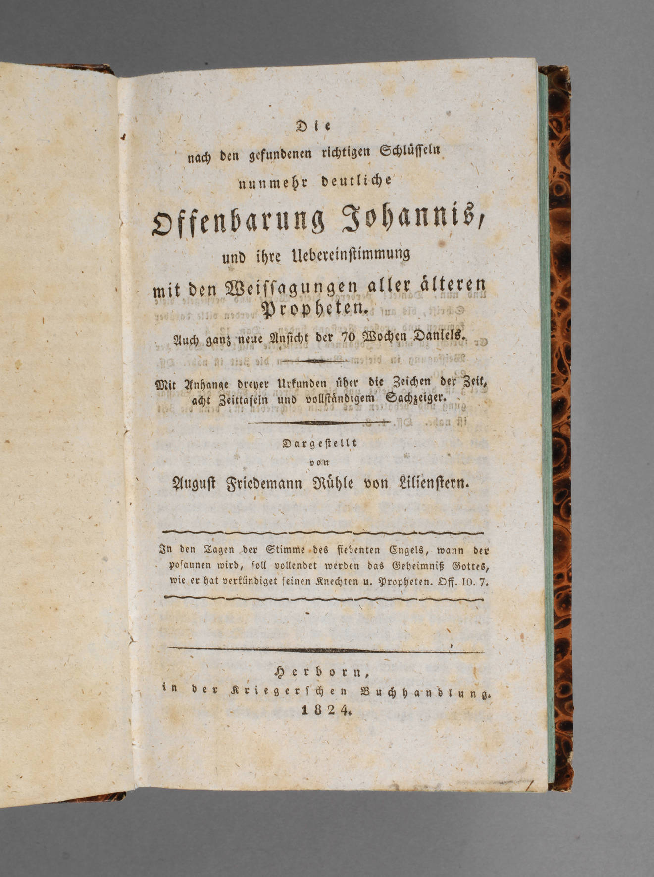 Die nach den gefundenen richtigen Schlüsseln nunmehr deutliche Offenbahrung Johannis und ihre Uebereinstimmung mit den Weissagungen aller älteren Propheten ..., von August Friedemann Rühle von Lilienstern, in der Kriegerschen Buchhandlung, Herborn 1824, Format 8°, XXXVI und 392 S., Grünschnitt, im Pappeinband d. Zt. mit Rückengoldprägung, min. stockfleckiges Exemplar.