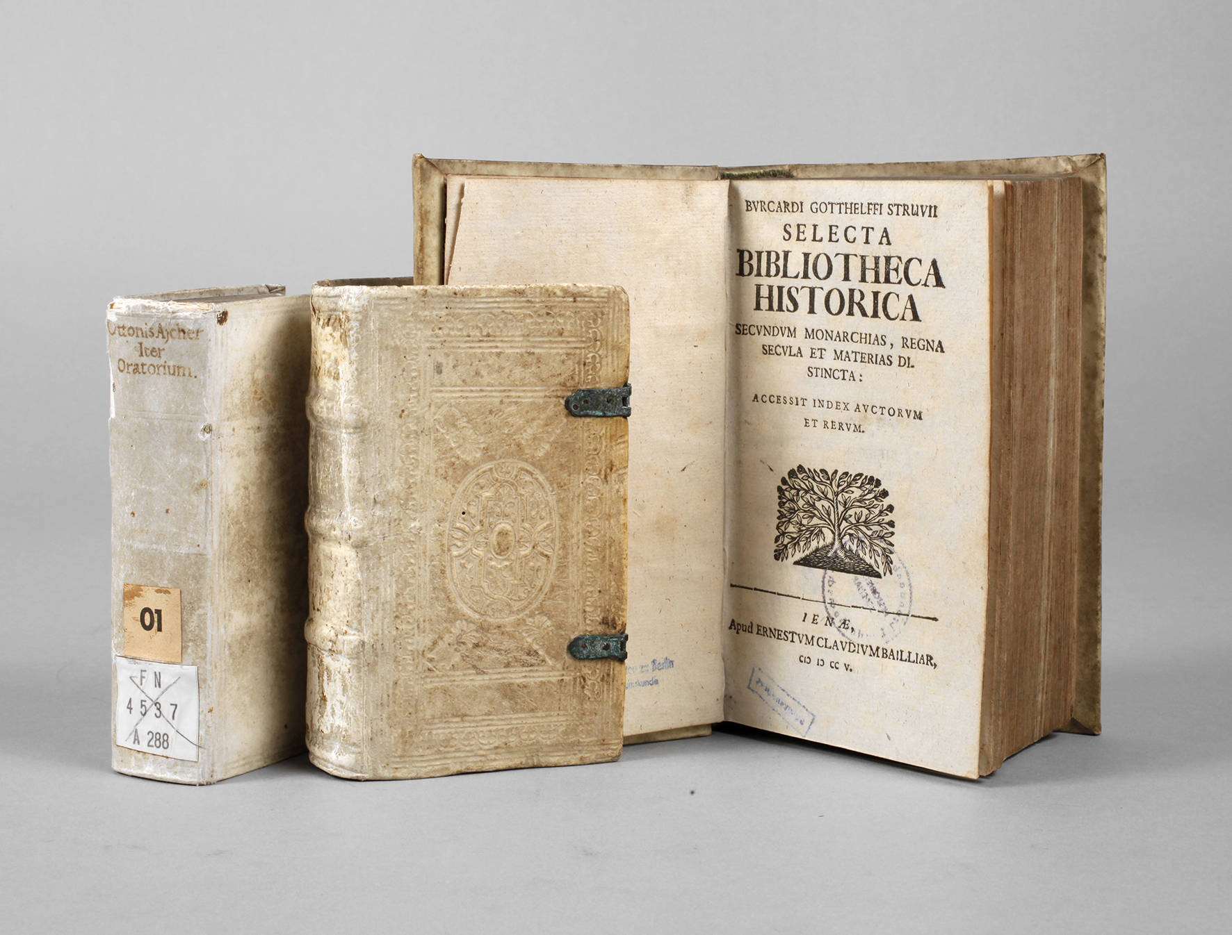 Iter oratorium, quo intra septem dies tota ars rhetorica absolvitur ... a P. Ottone Aicher, typis Johannis Baptistae Mayr, Salzburg 1675, Narrationum selectarum E Veteris aevi scriptoribus, liberi tres, volumen secundum ... Dilingae, apud Udalricun Rem. 1622, sowie Burcardi Gotthelffi Struuii Selecta Bibliotheca historica ..., apud Ernestum Claudium Bailliar, Jena 1705, Format 12° bzw. Kl. 8°, alle Texte in Latein, in Pergamenteinbänden der Zeit, eines davon dekorativ blindgeprägt, untersch. Alters- und Gebrauchsspuren, Schließen defekt.