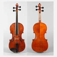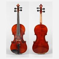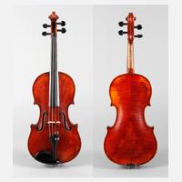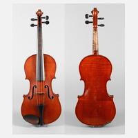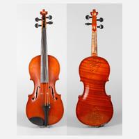 Ende 19. Jh., ohne Zettel, Boden mit Brandstempel Guseto, stark gewölbter, einteiliger Boden, leicht geflammt und in gelblich-braunem Lack, Zarge beidseitig mit feinem Filetband verziert, ornamental verzierte Schalllöcher, rissfreie Decke, oberflächliche Alters- und Gebrauchsspuren, mit Bogen, L Korpus 36,4 cm.