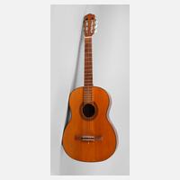 Otto Schneider, Meisterwerkstatt im Zupfinstrumentenbau, 1974, Ludwigsbrunn, sechssaitige Konzertgitarre, geteilter, gleichmäßig geflammter Boden in dunkelbraunem Lack, rissfreie Decke, Alters- und Gebrauchsspuren, L 100 cm.