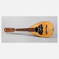 1920er Jahre, auf Prägemarke bezeichnet Meinel & Herold, Musikinstrumentenfabrik Klingenthal/Sa., achtsaitiges Zupfinstrument, fächerartig intarsierter Boden, Decke mit eingelassener floraler Verzierung aus Bein und Perlmutt, etwas rest.bed., L 60 cm.