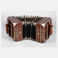 um 1920, gemarkt. C. Osw. Lenk, Zwickau i. Sa., palisanderfurniertes Gehäuse mit Ziereinlagen aus Perlmutt, vernickelte Metallteile, papierbespannter Blasebalg intakt, funktionstüchtig, gute Erhaltung mit leichten Gebrauchsspuren, L 40 cm.