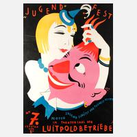 farbenfrohes Münchner Art déco-Veranstaltungsplakat ”Jugendfest am 7. Februar (1930) ... Motto: Jugend schützt vor Torheit nicht – im Theatersaal der Luitpoldbetriebe”, Farblinoldruck, rechts im Druck signiert und datiert ”Geis 30”, rechts unten Druckvermerk ”Linoldruck: G. Hirth Verlag A.G., München, Herrnstr. 4–10”, geringe Erhaltungsmängel, hinter Glas gerahmt, Maße ca. 116 x 83 cm. Künstlerinfo: eigentlich Joseph Nikolaus Geis, dt. Maler, Illustrator, Karikaturist und Graphiker (1892 München bis 1952 München), Mitarbeiter der Münchner Zeitschriften ”Jugend”, ”Simplicissimus”, der ”Fliegenden Blätter” und der ”Meggendorfer Blätter”, er erlangte Bekanntheit für Werbeplakate (Zoo München), Veranstaltungsplakate und politische Plakate für die SPD, Mitglied im Reichsverband Bildender Künstler Deutschlands, tätig in München, Quelle: Dressler, Wikipedia und Internet.