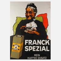 vor Kissen sitzende alte Dame mit Kaffeetasse, darunter Abbildung der Packung der ”Aecht Franck-Spezial Cichorie” und Werbeschriftzug ”Franck Spezial – Mein Kaffee-Zusatz”, Farblitho, um 1925, rechts im Druck signiert ”Ludwig Hohlwein”, Erhaltungsmängel, hinter Glas gerahmt, Falzmaß ca. 119 x 88 cm. Künstlerinfo: dt. Architekt, Maler, Graphiker und Kunstgewerbler (1874 Wiesbaden bis 1949 Berchtesgaden), zunächst Architekturstudium bei Friedrich Ritter von Thiersch an der Technischen Hochschule München, danach Assistent bei Paul Wallot in Dresden, 1899 Niederlassung in München und als Entwerfer für die Königliche Hof-Möbelfabrik Anton Pössenbacher tätig, ab 1903 selbständiger Innenarchitekt, ab 1906 vorzugsweise als Graphiker tätig, wurde laut Vollmer neben Thomas Theodor Heine der bedeutendste Plakatkünstler seiner Zeit, 1914 Ernennung zum Professor, Mitglied im Reichsverband Bildender Künstler Deutschlands, Vorstand der Künstlergruppe Isar, Ehrenmitglied des Vereins der Plakatfreunde Berlin, tätig in München, Quelle: Thieme-Becker, Dressler, Vollmer, Wikipedia und Internet.