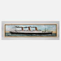 um 1920, ungemarkt, bezeichnet Hamburg-Amerika-Linie S.S.D. Imperator, Farblitho auf Papier, Darstellung des großen Passagierschiffs in voller Fahrt, hinter Glas gerahmt, etwas knickspurig, mit kleinem Einriss, Maße 15,5 x 55 cm.