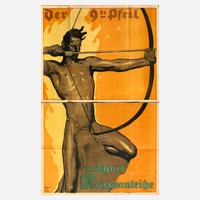 1918, Entwurf Fritz Erler, signiert, Druck Hollerbaum & Schmidt, Berlin, zweiteilig gefertigt, Farblithografie auf Papier, knickspurig, Altersspuren, Maße 140,6 x 95 cm.