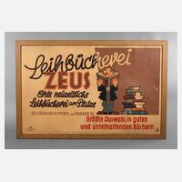 um 1920, gemarkt DRR sowie Schinnerling, Farblithografie auf Papier und Pappe, bezeichnet Leihbücherei Zeus, Die erste neuzeitliche Leihbücherei am Platze, Reichenbach im Vogtl., am Graben 14, in schlichter Holzleiste gerahmt, Altersspuren, kleinere Erhaltungsmängel, Maße 142 x 95,5 cm.