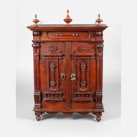 um 1880, Eiche massiv, braun gebeizt, zweitüriger Korpus reich mit Drechselteilen verziert, mit Schlüssel, H 50 cm.