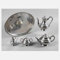 um 1920, gestempelt James Dixon und Sons Sheffield, Cornish Pewter 4212 4, Made in England, fünfteilig, Tablett mit zwei Kannen, Sahnegießer und Zuckerdose, Zinn gegossen, gute Erhaltung, L Tablett 45 cm.