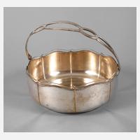 um 1920, gestempelt OX Straußenmarke I/O, Britanniametall versilbert und vergoldet, geschweifter, perlbandverzierter Rand, klappbarer Henkel, originaler Glaseinsatz, dieser an den Ecken minimalst bestoßen, D 22,5 cm.