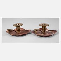 um 1900, Messing, Kupfer und Email, die Tropfschalen mit Mohnblüten bemalt, durchbrochen gearbeiteter Kerzenständer mit Griff und Daumenrast, D Tropfschale 14,5 cm.