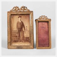 Ende 19. Jh., Messing fein ziseliert und vergoldet, der größere bekrönt von zwei blütengeschmückten Putten, der kleinere mit schlichter Schleifenbekrönung, beide verglast und mit Aufsteller, Altersspuren, IM 9 x 6 cm und 7,5 x 3 cm.
