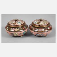 wohl Persien, um 1920, Messing und Email, aufwendige Einlegearbeit mit Blüten und Schmetterlingen, abnehmbarer Deckel, innen Gebrauchsspuren, D 12 cm.