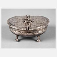 wohl 18. Jh., evtl. Cordoba Spanien, am Boden eine verschlagene Punze, zwei scharnierte Klappdeckel mit feiner Gravur, Elefant und Vogel zwischen Rocaillen und Blüten, ovale Form auf drei Tatzenfüßen mit Kugel, innen drei Fächer, innen ein Riechfläschchen, L 12 cm, G ca. 346 g.