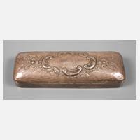 18. Jh., gestempelt Lion Passant, Stadtmarke Chester, Meisterpunze C.C., rechteckige Dose mit fein getriebenem Deckel, graviert und punziert mit Rocaillenmotiven und Blüten, etwas gedellt, sonst guter altersgemäßer Zustand, Maße 14 x 5 cm, G ca. 112 g.