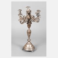 um 1880, gestempelt ”800 M”, mit Namenszug ”Walcher”, ovaler Fuß mit ausgestellten Ornamenten, reliefierten Kartuschen und Lorbeerbändern, geschliffener Glasaufsatz, getragen von Rollwerk mit Blüten und Dolden, dieser minimal bestoßen, ein Arm mit winzigem Einriss, L 35 cm.