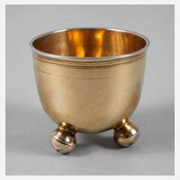 um 1770, Hamburger Stadtmarke, Meistermarke Johann Arend Webst, Silber vergoldet, die Mündung verziert mit Rillenbändern, auf drei Kugelfüßen stehend, diese etwas gedellt, H 5 cm, G ca. 35 g.