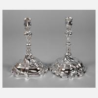 Meisterpunze Johann Balthasar Heckenauer, Meister ab 1746, fein getriebene schlanke Leuchter, gedreht, gerippt, mit weitem Stand, der Schaft hohl gearbeitet, in die Kerzentüllen übergehend, innen Tremulierstab, Meisterpunze und Augsburger Zirbelnuss mit Buchstabe Q, sehr gute originale Erhaltung, H 21 cm, G ca. 498 g. Quelle: Helmut Seeling, die Kunst der Augsburger Goldschmiede, Bd. III, Verlag C. H. Beck München 1980.