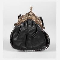 Silberstempel Amsterdam, französischer Garantiestempel 1809–1819, weitere Punzen, ”B” und ”C”, zwei weitere kleinere, nicht leserliche Punzen, reich mit Rocaillen und Engelsköpfen verziert, ein Engel als Verschlussclip, an der Rückseite eine stilisierte Figur, diese mit mittiger Öse, Reste alter Vergoldung, Leder erneuert, altersgemäßer Zustand, L Bügel 13,5 cm.