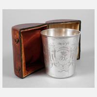 Kopenhagener Stadtmarke, Beschauzeichen Peter R. Hinnerup (1840–63), Meistermarke ”AM” im Rechteck, konischer Becher mit verstärktem Lippenrand, fein gravierte Kartuschen mit den Monogrammen von König Friedrich VII., König von Dänemark, gestorben 1863, und Frau Luise Gräfin Donner, in einem feinen Lederetui mit rotem Samt und cremefarbener Seide ausgekleidet, datiert den 31. Mai 1869, normale Gebrauchs- und Altersspuren, H 10 cm, G ca. 170 g.
