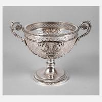 Birmingham, um 1900, verschiedene Marken mit Lion Passant, Hersteller J & C, Geschenk zur Silberhochzeit von Mr. und Mrs. Crick, 2. Februar 1907, auf vier Tatzenfüßen stehend, getriebene Rocaillenmotive und Blüten, in Schlangenoptik ziseliert, abnehmbarer Deckel, H 20 cm, G ca. 196 g.