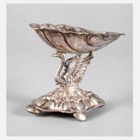 Anfang 19. Jh., ungepunzt, Silber geprüft, fein getrieben, auf vier flachen Kugelfüßen, verziert mit Palmetten, Muschel getragen von einem Schwan, alt repariert, Altersspuren, H 7 cm, G ca. 40 g.