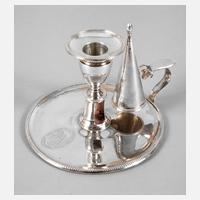 wohl Sheffield, 1. Hälfte 19. Jh., verschiedene Punzen mit Lion Passant, Hersteller I.P. & Co., dreiteilig mit abnehmbarer Tropfschale und Kerzenlöscher, graviertes Besitzerwappen, umlaufend Perlbänder, am Griffansatz alt repariert, geputzt, H 11 cm, G ca. 216 g.