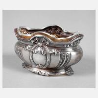 um 1880, gestempelter Minervakopf, undeutliche Herstellermarke, innen vergoldet, Ovalform mit floralen und ornamentalen Reliefs, originaler Glaseinsatz mit geschliffenem Bodenstern, Altersspuren, L 7,5 cm, G ohne Einsatz ca. 21 g.
